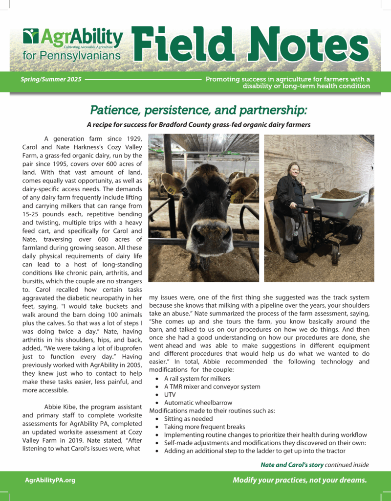 Field Notes is a printed newsletter from AgrAbility PA that shares news, farmer stories, events, tips, resources, and information to assist farmers and agricultural workers with disabilities or long-term health conditions.